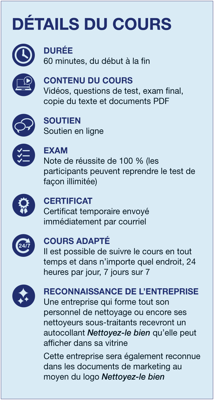 Ce programme de formation est tout à fait approprié pour le personnel de nettoyage ou les nettoyeurs sous-traitants, mais les nettoyeurs n’arrivaient jamais à se tenir à jour sur la portée et la fréquence requises pour avoir une entreprise sûre et propre. Il est recommandé au personnel qui ne fait pas habituellement du nettoyage de suivre aussi ce programme.
