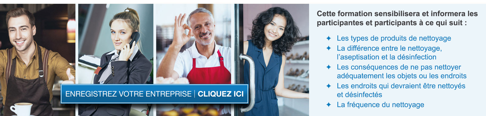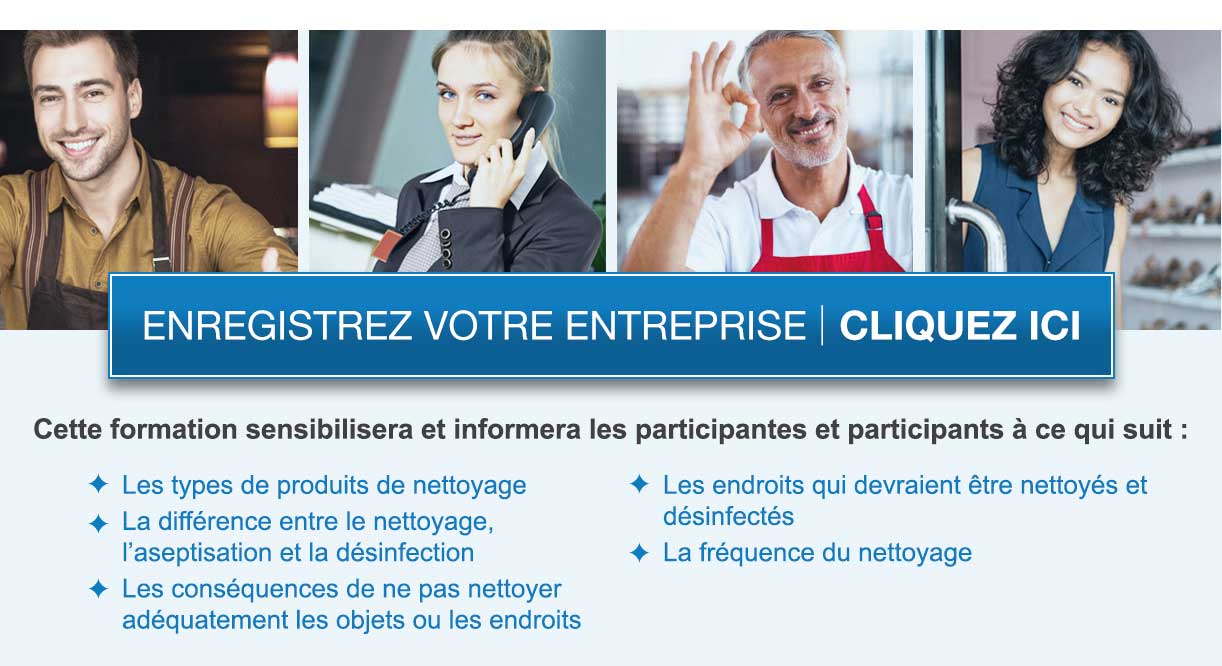 Il est important de noter que cette séance N’EST PAS un programme qui montre aux participants COMMENT être des nettoyeurs, ou qui remplace les politiques et procédures internes. Il s’agit d’un programme de sensibilisation et d’information qui tient compte de notre situation actuelle dans l’ère de la COVID-19, ainsi que d’un programme qui présente des avantages durables aux entreprises. Parce que votre entreprise tient à offrir un milieu propre et sûr, elle aura un avantage concurrentiel par rapport aux autres.